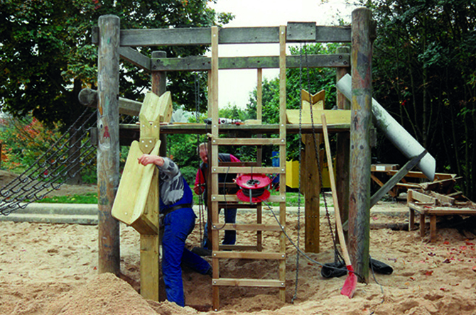 Seit 1995 bietet der Spielplatzsanierungsdienst langzeitarbeitslosen Menschen eine sinnvolle Beschäftigung mit greifbarem Arbeitsergebnis und eine wertvolle Weiterbildung im Handwerk.