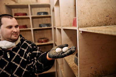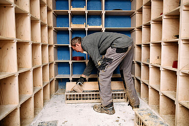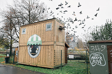 Angeleitet von einem Taubenwart kümmern sich eine geförderte Arbeitskraft und Mitarbeitende in Arbeitsgelegenheiten um die regelmäßige Reinigung und Instandhaltung der Taubenhäuser.