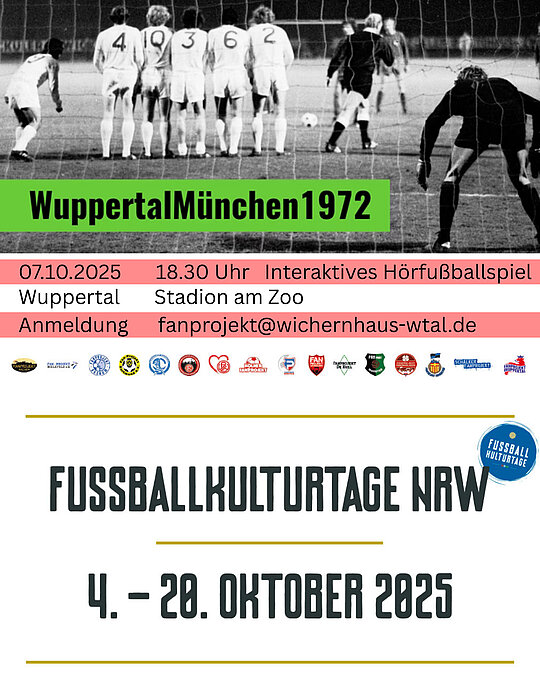 Zum Jubiläum der Fußballkulturtage NRW laden wir Sie/euch ein, ein legendäres Stück Wuppertaler Fußballgeschichte neu zu erleben: Am 7. Oktober präsentieren wir ein interaktives Fußballhörspiel zum unvergessenen Spiel Wuppertaler SV – FC Bayern München.